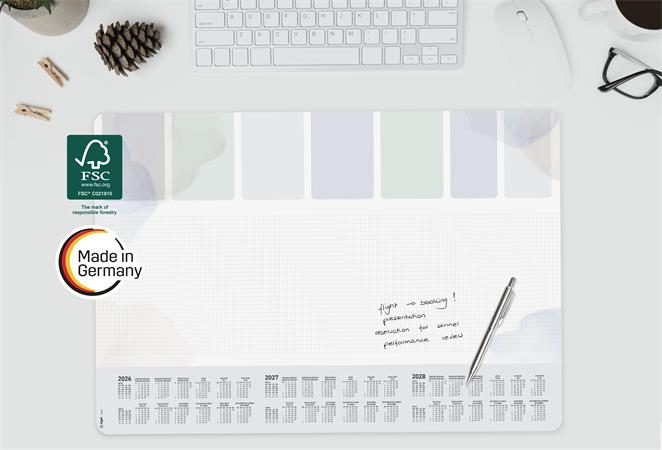 Vysokokvalitná písacia podložka na stôl vyrobená z papiera s gramážou 80 g/m² a pevnou zadnou stranou. - s 3-ročným kalendárom (2026/2027/2028) - s týždenným plánovačom - štvrojazyčná: angličtina, nemčina, francúzština a holandčina - veľkosť: približne A2 - vegánsky produkt - zaoblené rohy - 30 listov - certifikovaná FSC