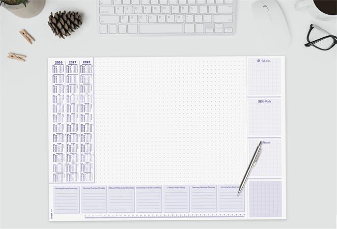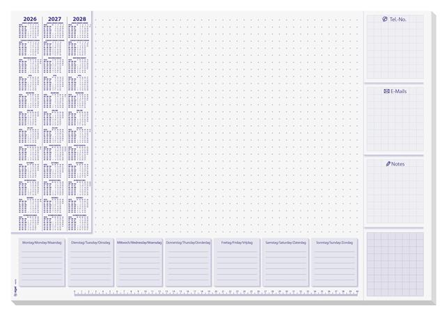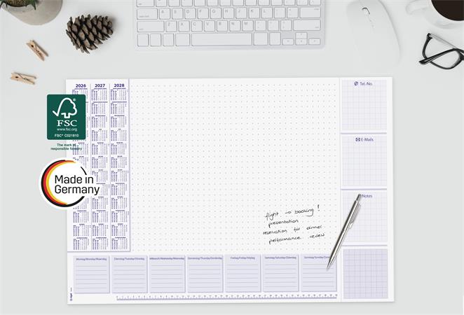 s trojročným kalendárom (2026/2027/2028) -s týždenným plánovačom -trojjazyčný: angličtina, nemčina, holandčina -veľkosť: približne A2 -odolný, protišmykový a vďaka masívnej kartónovej zadnej doske úplne rovno leží -použiteľný aj ako podložka pod myš -30 listov -farba: fialová -s certifikátom FSC