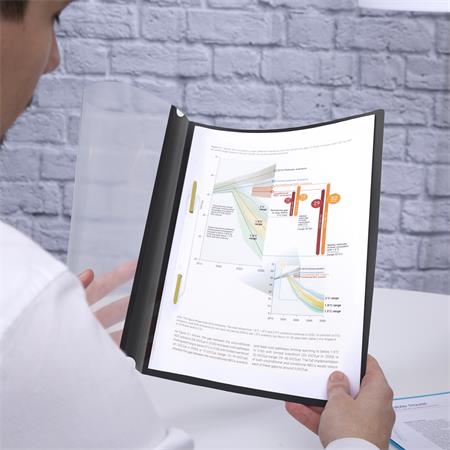 Vyobený zo 100% recyklovaného materiálu. -na dlhopdobé používanie  priehľadná predná strana s hrúbkou 140 µ -čierna zadná strana s hrúbkou 200 µ  -kapacita listov: 30 listov (80 g)  -formát: A4 -rozmery: 229 x 309 mm (š x v)