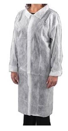 Návštevnícky plášť na jedno použitie chráni odev pred znečistením — ideálny pre návštevníkov v priemyselnom, laboratórnom alebo hygienickom prostredí. -materiál: netkaný polypropylén (20 gsm) -bez vrecka -so štyrmi zapínaniami na suchý zips -s golierom, na zápästiach s elastickým lemom -farba: biela -veľkosť: M (100 x 125 cm - dĺžka x šírka) -balenie: 10 ks/bal, 100 ks/kartón